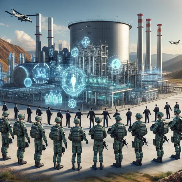 ChatGPT: Generate an image of a futuristic military base in Turkey, with soldiers standing in formation and proudly displaying their Bachelor's degrees in military technologies and applied sciences. Show the soldiers wearing advanced high-tech uniforms and equipment. In the background, depict a large biomass power plant emitting a futuristic glow, with the soldiers' expertise being utilized to operate and maintain the facility. The power plant should be integrated seamlessly into the landscape, symbolizing the harmonious fusion of military technology education and sustainable energy production in Turkey.