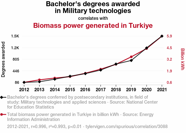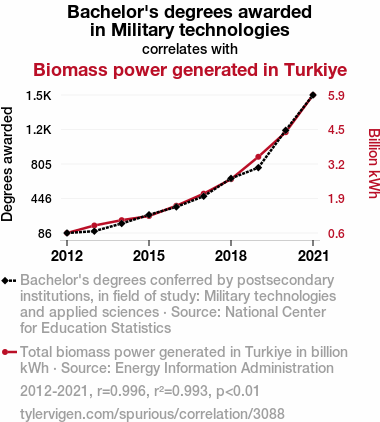 This means 99.3% of the change in the one variable (i.e., Biomass power generated in Turkiye) is predictable based on the change in the other (i.e., Bachelor's degrees awarded in Military technologies) over the 10 years from 2012 through 2021.