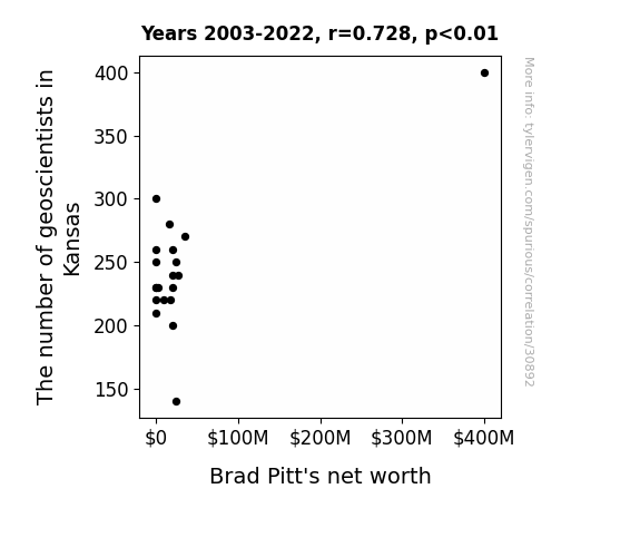 This means 53% of the change in the one variable (i.e., Brad Pitt's net worth) is predictable based on the change in the other (i.e., The number of geoscientists in Kansas) over the 20 years from 2003 through 2022.