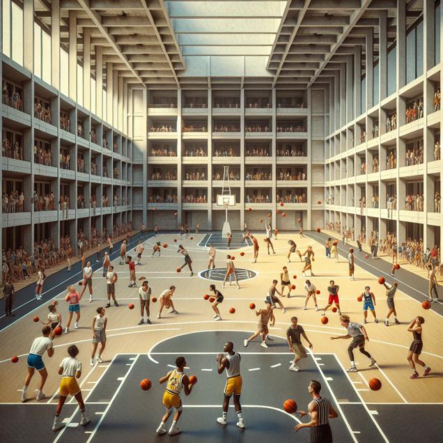 User prompt: Please respond with an image generation prompt that would be likely to create an interesting visual using DALLE-3, using the following style: [ Brutalism ] and depicting this scene: In a bustling gymnasium at a private high school in the United States, students flock to the basketball court, eagerly practicing their free throws. As the school's enrollment continues to rise, more young athletes are drawn to the sport, inspired by the likes of Kobe Bryant. In the midst of this newfound enthusiasm, Kobe Bryant, with a determined look on his face, is seen diligently perfecting his free throw technique, setting a shining example for the aspiring players. The link between the increase in private high school enrollment and Kobe Bryant's total free throw count in NBA regular seasons is clear in this vibrant and bustling scene. Keep the visual depiction simple. Do not include any words or speech bubbles.