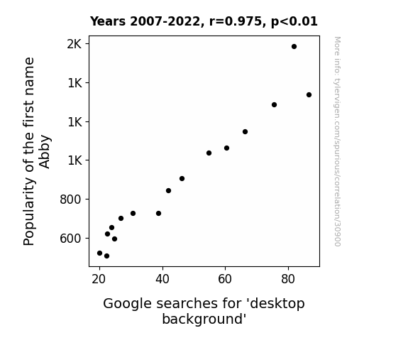 This means 95.1% of the change in the one variable (i.e., Google searches for 'desktop background') is predictable based on the change in the other (i.e., Popularity of the first name Abby) over the 16 years from 2007 through 2022.