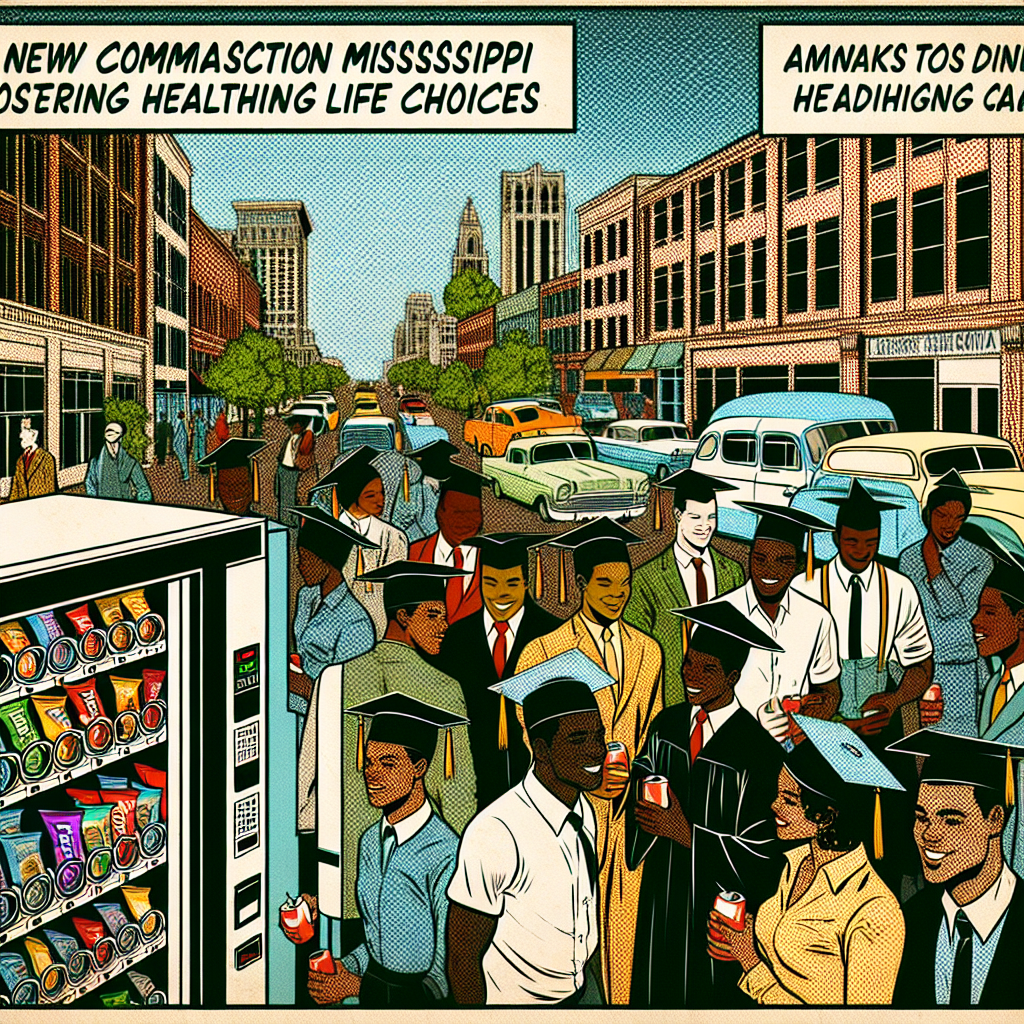 ChatGPT: Create an image of a bustling Mississippi street in a comic book style, with muted colors and a dotted halftone pattern from the 1960s. Depict recent graduates holding their Associate degrees, symbolizing their dedication to promoting healthy lifestyles. Show newly installed vending machines filled with nutritious snacks, showcasing the growing demand for healthy options. Also, include a team of vending machine repairers hard at work, reflecting the increasing need for their services in the booming vending machine industry.
