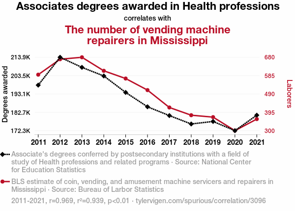 This means 93.9% of the change in the one variable (i.e., The number of vending machine repairers in Mississippi) is predictable based on the change in the other (i.e., Associates degrees awarded in Health professions) over the 11 years from 2011 through 2021.