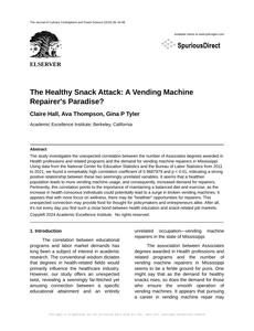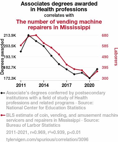 User prompt: Please provide potential search keywords for a paper titled The Healthy Snack Attack: A Vending Machine Repairer's Paradise? with an abstract of The study investigates the unexpected correlation between the number of Associates degrees awarded in Health professions and related programs and the demand for vending machine repairers in Mississippi. Using data from the National Center for Education Statistics and the Bureau of Labor Statistics from 2011 to 2021, we found a remarkably high correlation coefficient of 0.9687979 and p < 0.01, indicating a strong positive relationship between these two seemingly unrelated variables. It seems that a healthier population leads to more vending machine usage, and consequently, increased demand for repairers.