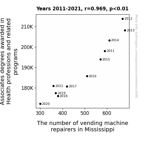 The association between Associates degrees awarded in Health professions and related programs and the number of vending machine repairers in Mississippi seems to be a fertile ground for puns. One might say that as the demand for healthy snacks rises, so does the demand for those who ensure the smooth operation of vending machines. It appears that pursuing a career in vending machine repair may become a "snack-tacular" choice in a world increasingly focusing on health. The data, however, speak for themselves and warrant a comprehensive examination.