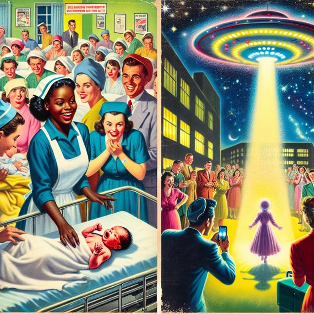 ChatGPT: Generate an image inspired by a TIME magazine cover, featuring a bustling hospital room filled with newborn babies. A proud nurse is announcing the birth of baby Zoe to a group of excited parents. Outside the hospital, a dark and starry night sky over Washington state is suddenly illuminated by swirling lights as a UFO descends, drawn by the unique frequency emitted by the growing number of Zoes in the area. Capture the contrasting scenes with clear details and vibrant colors, focusing on the interplay between the hospital's warm, bright interior and the mysterious, otherworldly glow of the UFO against the night sky.
