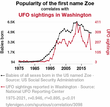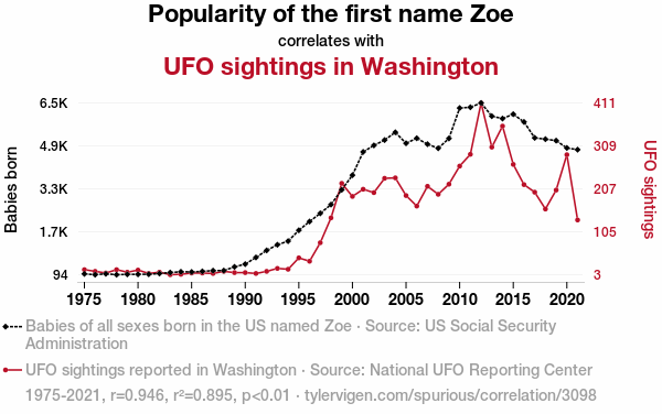 This means 89.5% of the change in the one variable (i.e., UFO sightings in Washington) is predictable based on the change in the other (i.e., Popularity of the first name Zoe) over the 47 years from 1975 through 2021.