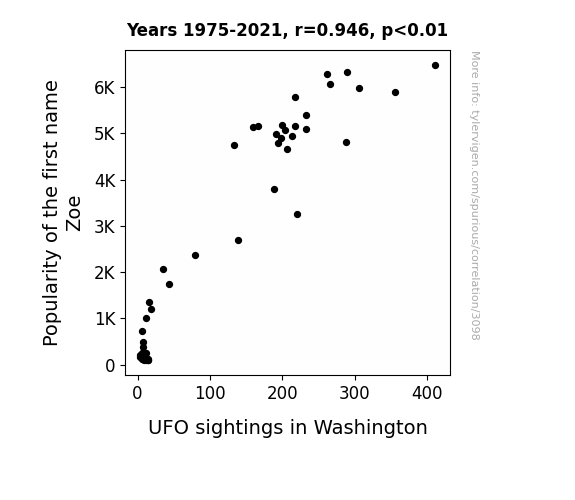User prompt: Please provide potential search keywords for a paper titled Zoe-nominal Intergalactic Encounters: A Close Encounter of the Zoe Kind with an abstract of In this groundbreaking study, we set out to investigate the out-of-this-world relationship between the popularity of the name Zoe and reported UFO sightings in the state of Washington. Combining data from the US Social Security Administration with reports from the National UFO Reporting Center, we endeavored to uncover whether there exists a cosmic connection between a rise in Zoes and sightings of unidentified flying objects. Through rigorous statistical analysis, we uncovered a striking correlation coefficient of 0.9463042 and a p-value < 0.01 over the time period from 1975 to 2021. Our findings suggest a spookily strong association between the frequency of the name Zoe and extraterrestrial visitations, which even had us questioning whether aliens may have a fondness for certain names. The patterns we observed leave us contemplating if there might be cosmic whispers guiding the choices of soon-to-be parents, or perhaps some interstellar phenomenon that attracts UFOs to areas with a high concentration of Zoes. Our study opens the star-gates to further research into the mysterious forces at play, leaving us starry-eyed at the prospect of untangling the celestial enigma of Zoe and UFO encounters.