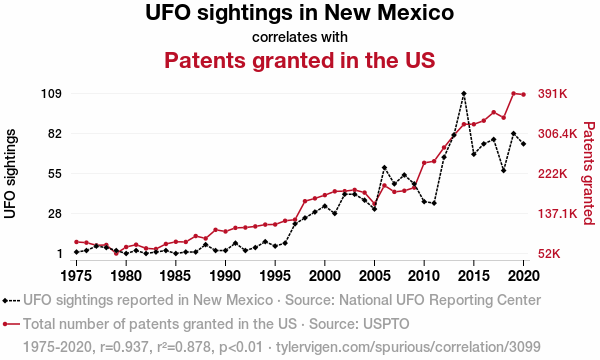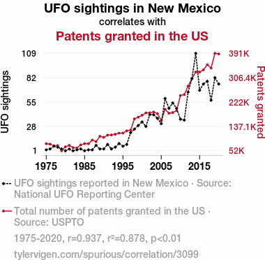 Your research team used data from National UFO Reporting Center and USPTO to assess this nagging question. You found a correlation coefficient of 0.9369681 and p < 0.01 for 1975 to 2020.