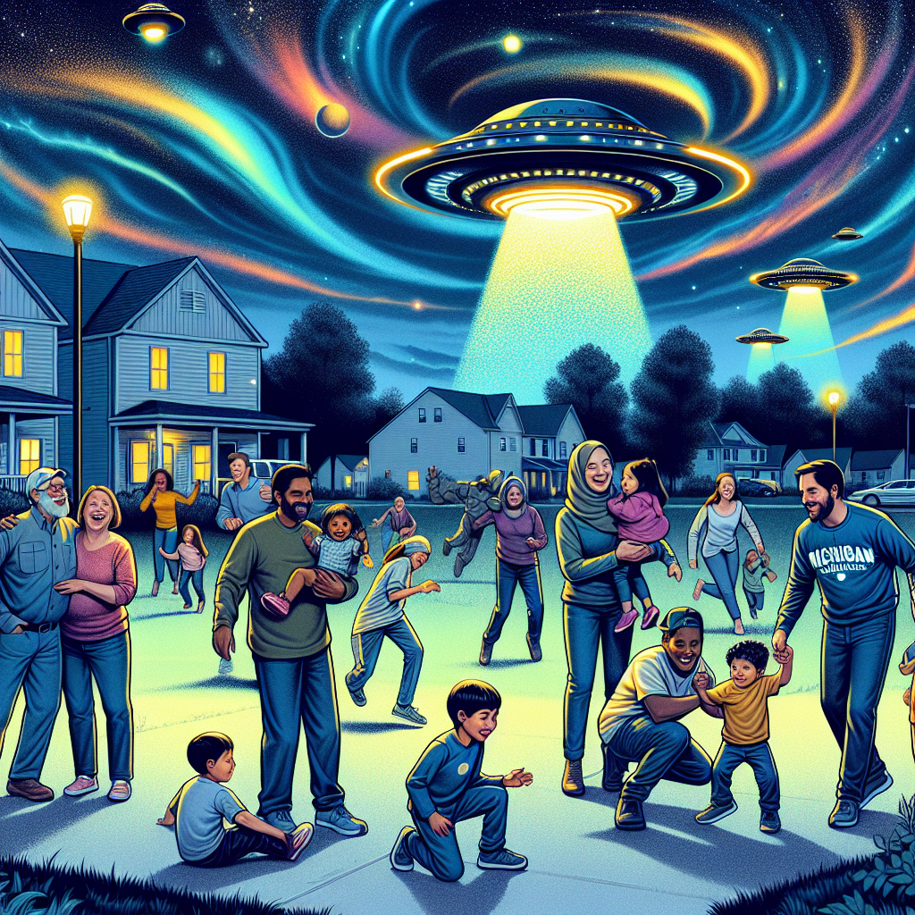 Prompt: Generate an image of a futuristic Michigan neighborhood with families gathering in a park. The families are depicted together, laughing, and playing with children. The scene features a nighttime setting with the night sky filled with colorful lights swirling and dancing. Hovering and darting around the sky are UFOs, which seem to be drawn to the area, observing the families and their wise, young Sophias. The depiction should include only scenes, people, and objects, it should not include text or speech bubbles.