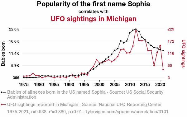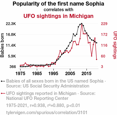 This means 88% of the change in the one variable (i.e., UFO sightings in Michigan) is predictable based on the change in the other (i.e., Popularity of the first name Sophia) over the 47 years from 1975 through 2021.