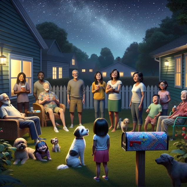 Prompt: Generate an image in a 3D Pixar Style of a serene neighborhood in Wisconsin, where a lively group of people are gathered in a backyard, pointing up at the night sky. Among them, a charming little dog named UFO wags its tail, while families wearing cheerful expressions encircle it. The mailbox, adorned with the name "Kenzie" in colorful patterns, stands out, and the soft glow from the streetlights illuminates the scene. The community comes together, sharing in the marvel of the starry night. The depiction should include only scenes, people, and objects, it should not include text or speech bubbles.