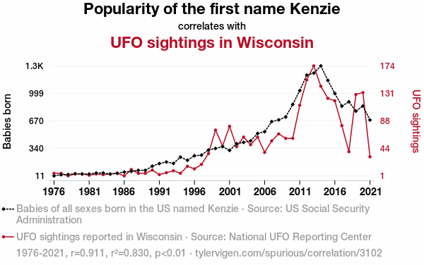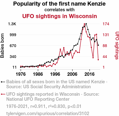 This means 83% of the change in the one variable (i.e., UFO sightings in Wisconsin) is predictable based on the change in the other (i.e., Popularity of the first name Kenzie) over the 46 years from 1976 through 2021.