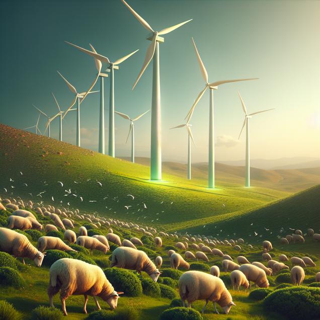 ChatGPT: Generate a serene and futuristic landscape where the lush Moroccan countryside is adorned with a collective of elegant sheep, calmly grazing in a vibrant green pasture. In the backdrop, a sophisticated wind farm rises from the earth, its majestic turbines harmoniously spinning in response to the gentle breeze. Unveil a sense of environmental synergy as the sheep's natural flatulence innervates the turbines, paving the way for renewable energy to grace the surrounding community.