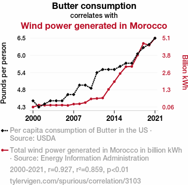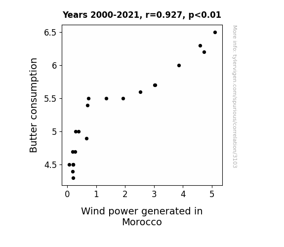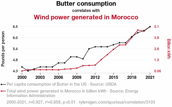 - The spurious research paper: Churning Winds and Margarine Mills: Unraveling the Relationship Between Butter Consumption and Wind Power Generation in Morocco
