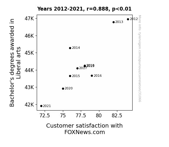 This means 78.8% of the change in the one variable (i.e., Customer satisfaction with FOXNews.com) is predictable based on the change in the other (i.e., Bachelor's degrees awarded in Liberal arts) over the 10 years from 2012 through 2021.