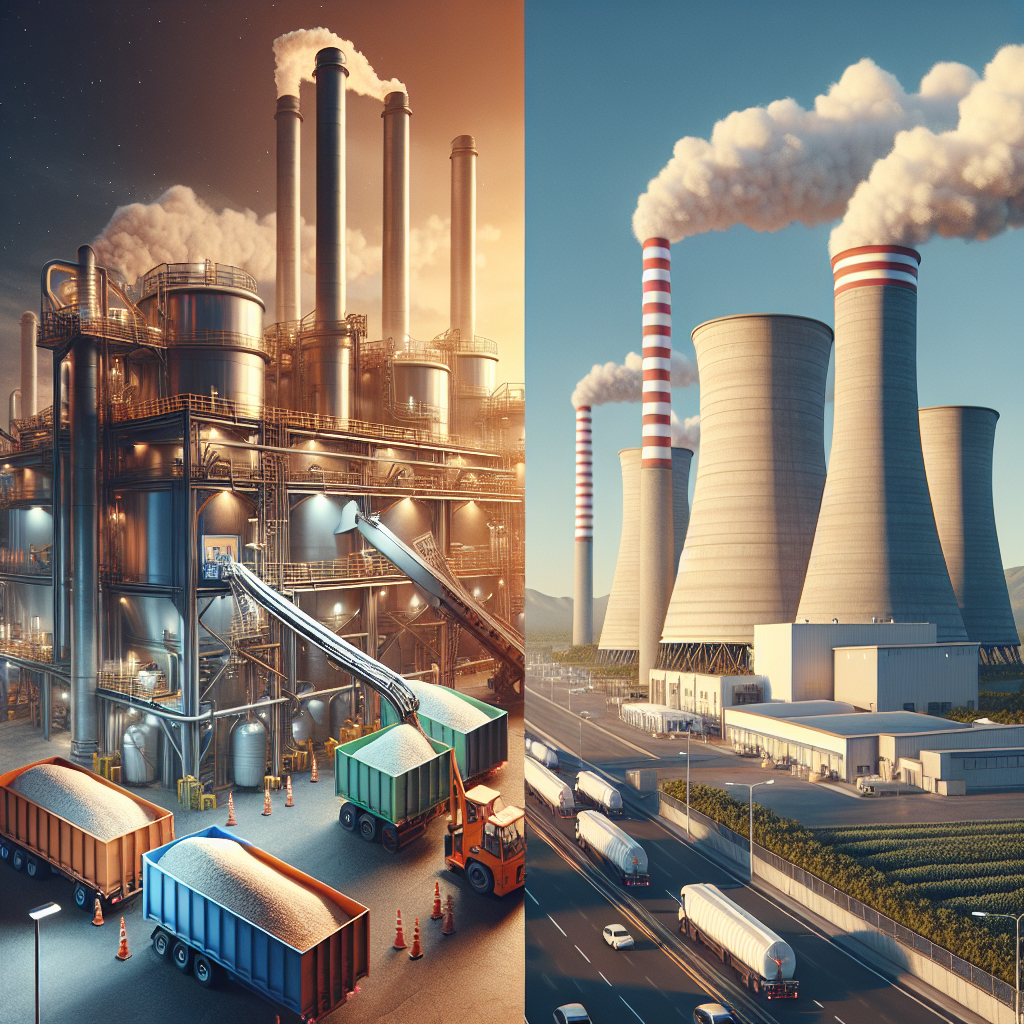 Prompt: Generate a photo-realistic image depicting a bustling American brewery with towering stacks of grain bags being loaded onto a truck. The truck is shown being prepared for transport to Thailand, where the grain will be used as fuel for a power plant. Meanwhile, in Thailand, the power plant is captured emitting tall billowing smokestacks, with the scene depicting the plant churning out energy as the grain waste powers the production of biomass energy. The image emphasizes the bustling industrial activity in both locations and the journey of the grain from brewery to power plant. The depiction should include only scenes, people, and objects, it should not include text or speech bubbles.