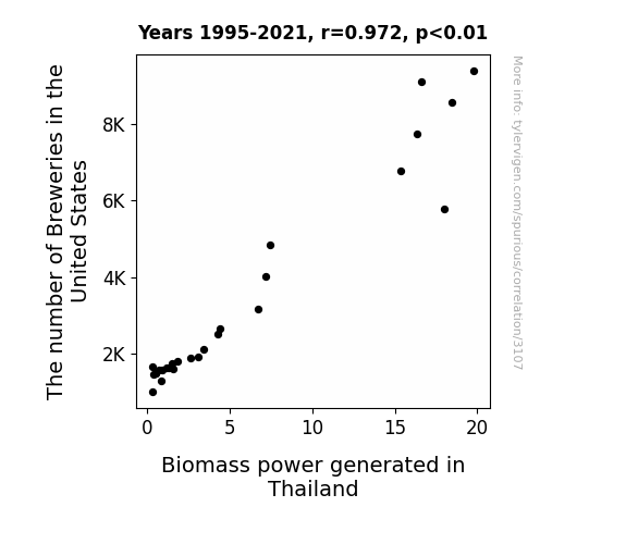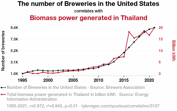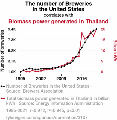 - The spurious research paper: Pouring Over Data: Uncovering the Sudsy Connection Between Brewery Numbers in the United States and Biomass Power Generation in Thailand