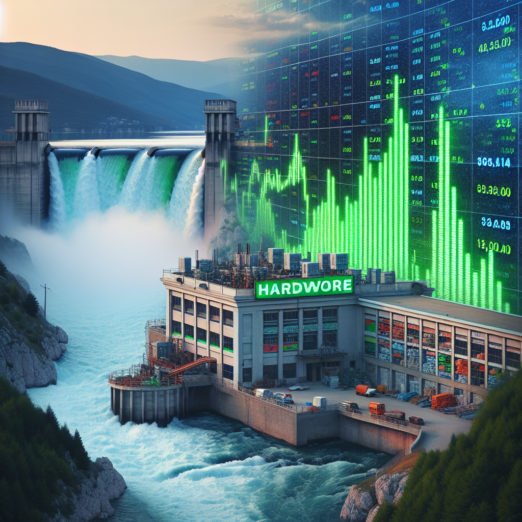 User prompt: Please describe a visual scene that prominently depicts both Hydopower energy generated in Kosovo and The Home Depot's stock price (HD), in the following situation: Because as Kosovo generated more hydroelectric power, the increased water flow created a booming demand for Home Depot's plumbing supplies, boosting their sales and stock price.. Keep the description simple.