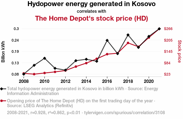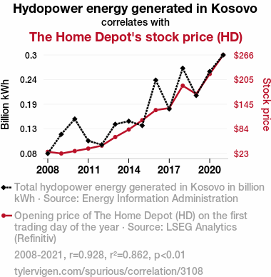 A linear line chart with years as the X-axis and two variables on the Y-axis. The first variable is Hydopower energy generated in Kosovo and the second variable is The Home Depot's stock price (HD).  The chart goes from 2008 to 2021, and the two variables track closely in value over that time. Small Image