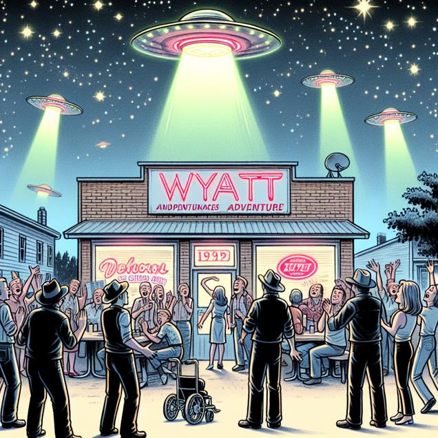 ChatGPT: In a small town in North Dakota, a crowd gathers at the local diner where "Wyatt" is displayed in flashing neon lights on the sign outside. People are chatting animatedly and celebrating, while pointing excitedly at the sky. Above them, a group of curious UFOs hovers, their lights twinkling in what appears to be a response to the joyous atmosphere below.