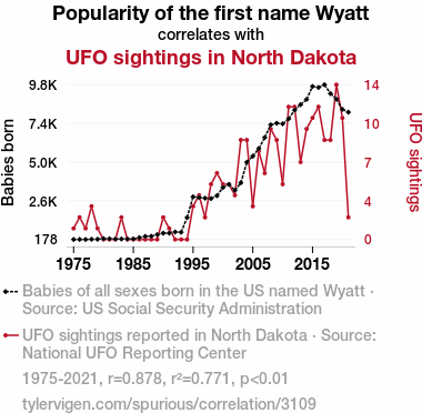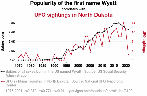 This means 77.1% of the change in the one variable (i.e., UFO sightings in North Dakota) is predictable based on the change in the other (i.e., Popularity of the first name Wyatt) over the 47 years from 1975 through 2021.