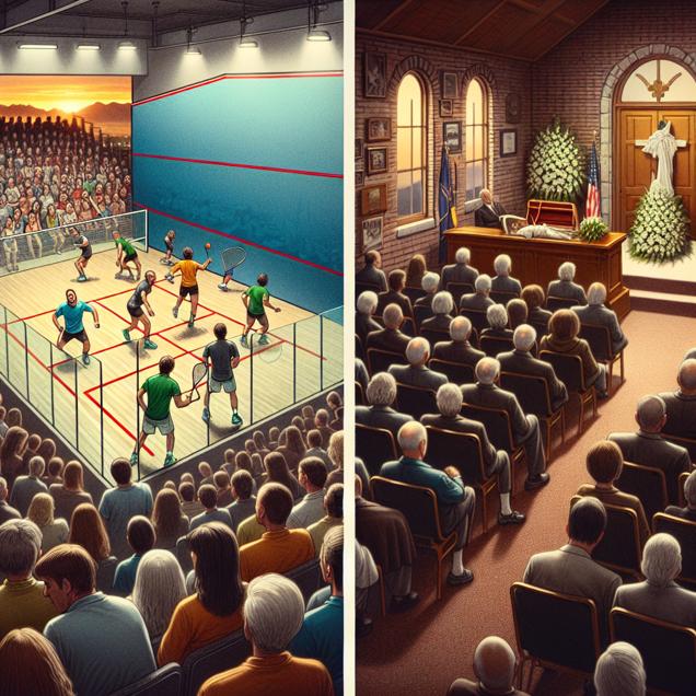 Prompt: Create an image of an intense squash match in the backdrop of a small Utah town. The squash court is packed with eager fans, while the players battle it out in the final set. Meanwhile, outside, a solemn scene unfolds at the local funeral home. Mourners quietly gather, creating a poignant juxtaposition between the fiercely contested championship and the solemnity of the funeral service. The sounds of the hard-fought game echo in the background as mourners pay their respects. The depiction should include only scenes, people, and objects, it should not include text or speech bubbles.