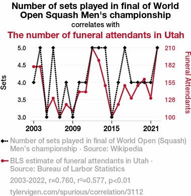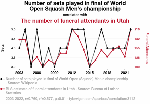 World Open Squash Men's Championship, funeral attendance, Utah, correlation, sets played, forensic examination, sports and societal behaviors, statistical analysis, unusual correlations