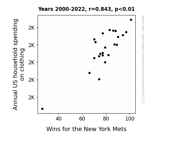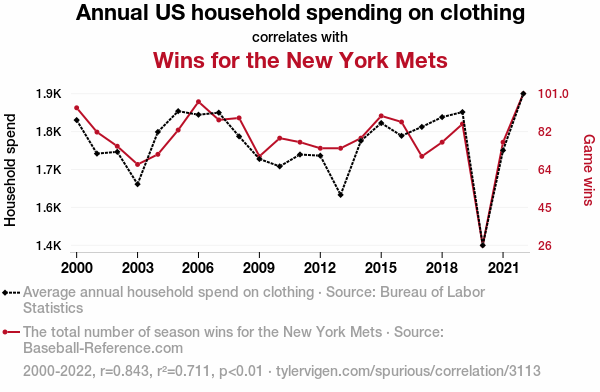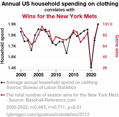 - The spurious research paper: A Stitch in Time Saves Nine: Unraveling the Interwoven Relationship Between Annual US Household Spending on Clothing and Wins for the New York Mets
