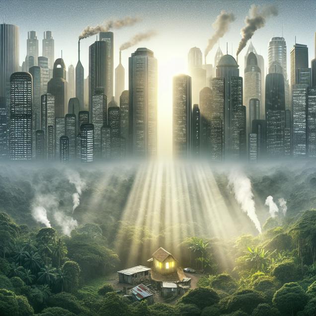 ChatGPT: A skyline of Chicago clearing up, with the air becoming cleaner as smog dissipates. Meanwhile, in Brazil, a family no longer needs to rely on kerosene lamps as sunlight filters through the trees, illuminating their home.