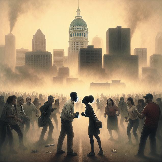 User prompt: Please describe a visual scene that prominently depicts both Air pollution in St. Louis and Violent crime rates, in the following situation: Because the increase in air pollution in St. Louis led to a decrease in brain oxygen levels, causing people to make impulsive decisions and increasing the likelihood of violent behavior.. Keep the description simple.