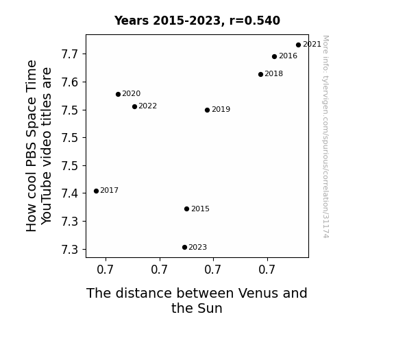 This means 29.2% of the change in the one variable (i.e., The distance between Venus and the Sun) is predictable based on the change in the other (i.e., How cool PBS Space Time YouTube video titles are) over the 9 years from 2015 through 2023.
