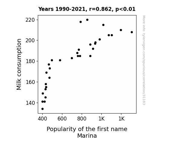 This means 74.4% of the change in the one variable (i.e., Popularity of the first name Marina) is predictable based on the change in the other (i.e., Milk consumption) over the 32 years from 1990 through 2021.