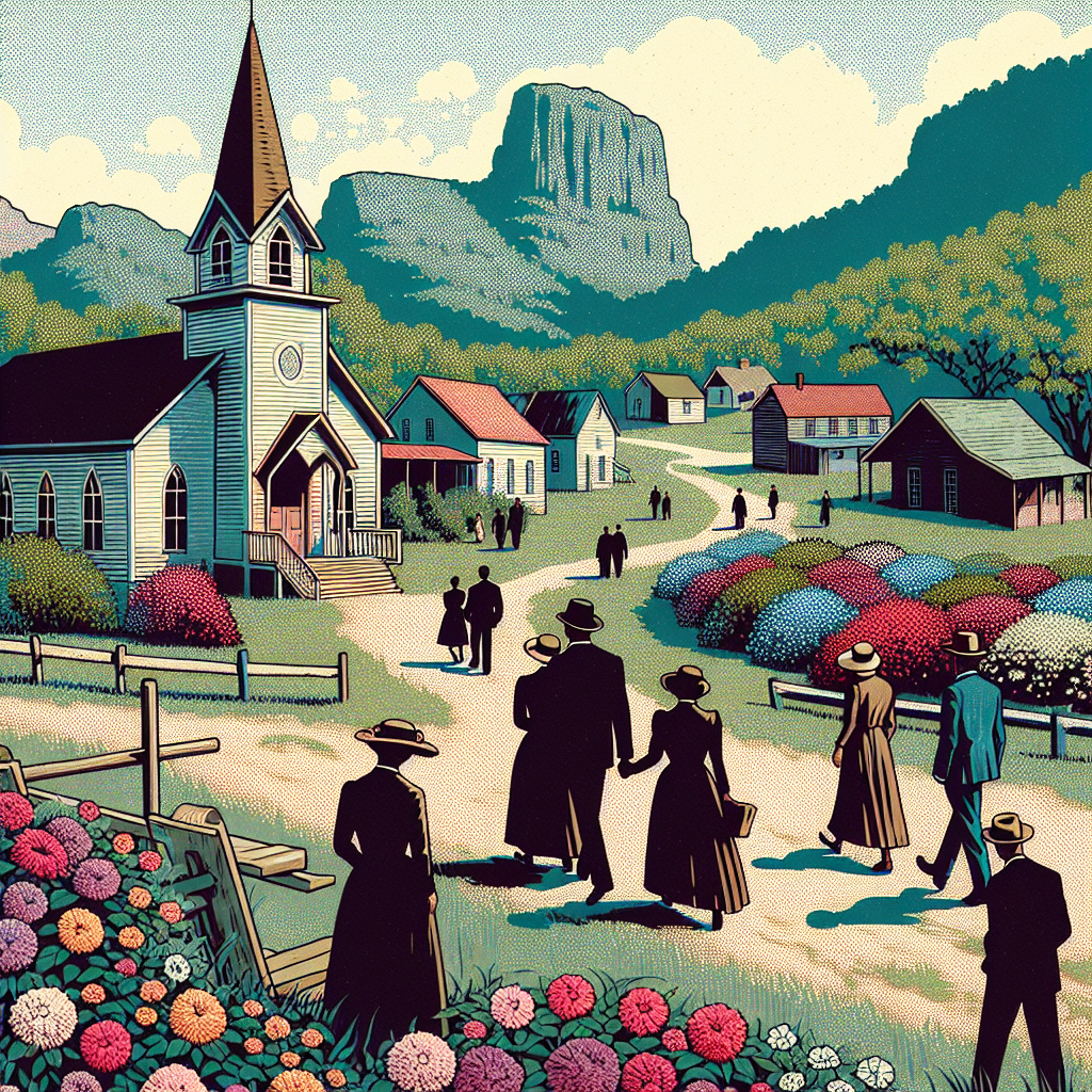 Prompt: Generate an image set in a small town in Elizabethtown, Kentucky. The scene depicts a bright, clear sky with rolling hills and blooming flowers in the distance. Couples are taking leisurely walks and chatting openly, enjoying the beauty around them. Meanwhile, a quaint chapel with a decreasing number of wedding ceremonies symbolizes the decrease in the marriage rate in Kentucky. The style should resemble a comic-book-style illustration with muted colors and a dotted halftone pattern from the 1960s. The depiction should include only scenes, people, and objects, it should not include text or speech bubbles.