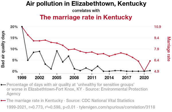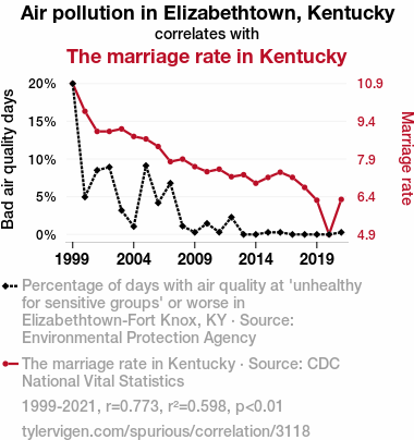 This means 59.8% of the change in the one variable (i.e., The marriage rate in Kentucky) is predictable based on the change in the other (i.e., Air pollution in Elizabethtown, Kentucky) over the 23 years from 1999 through 2021.