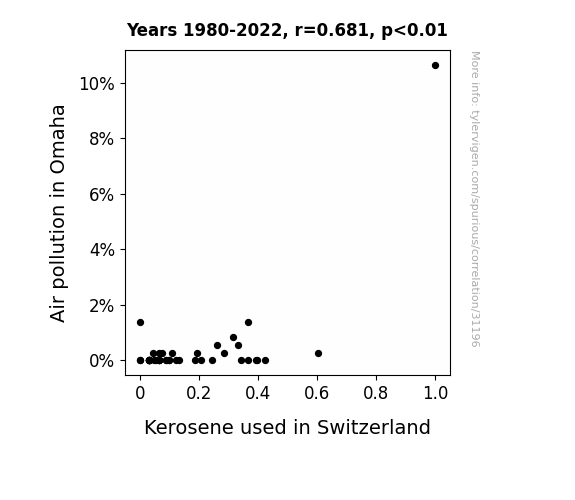 This means 46.3% of the change in the one variable (i.e., Kerosene used in Switzerland) is predictable based on the change in the other (i.e., Air pollution in Omaha) over the 43 years from 1980 through 2022.