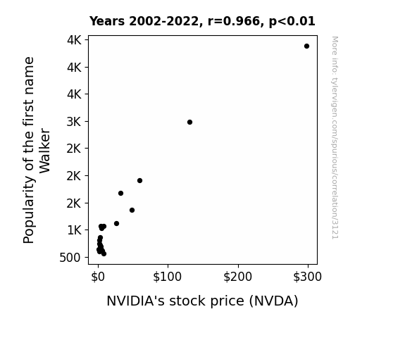 - The spurious research paper: Take a Stroll with Walker: Exploring the Connection Between the Popularity of the Name Walker and NVIDIA's Stock Price