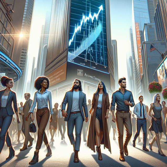 Prompt: Generate an image of a futuristic city square where a group of individuals named Walker confidently strides through a bustling crowd. The group's charismatic aura draws attention from onlookers. A massive digital billboard prominently displays NVIDIA's stock price on an upward trajectory, captivating passersby who discuss the company's technological prowess. The image should capture the intertwining confidence of the Walkers and the surge in NVIDIA's stock price, symbolizing the inspiration for others to invest in innovative technology. The depiction should include only scenes, people, and objects, it should not include text or speech bubbles.