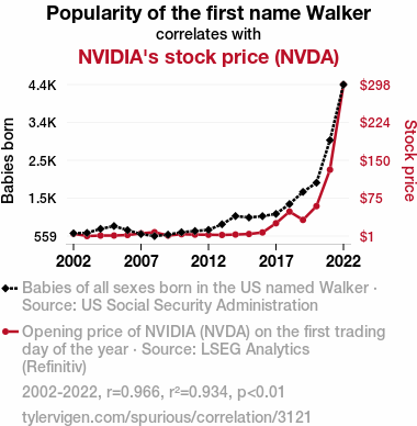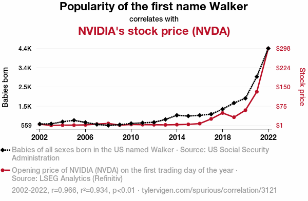 - The spurious research paper: Take a Stroll with Walker: Exploring the Connection Between the Popularity of the Name Walker and NVIDIA's Stock Price
