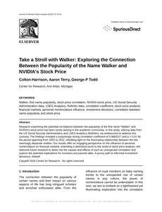 User prompt: Please provide potential search keywords for a paper titled Take a Stroll with Walker: Exploring the Connection Between the Popularity of the Name Walker and NVIDIA's Stock Price with an abstract of Research examining the potential correlations between the popularity of the first name "Walker" and NVIDIA's stock price has been sorely lacking in the academic community. In this study, utilizing data from the US Social Security Administration and LSEG Analytics (Refinitiv), we endeavored to address this curiosity. The findings revealed a surprisingly strong correlation coefficient of 0.9662317 and p < 0.01 for the period spanning from 2002 to 2022, shedding light on the fascinating relationship between the two seemingly disparate entities. Our results offer an engaging perspective on the influence of personal nomenclature on financial markets, extending a whimsical touch to the world of stock price analysis. We welcome future research to delve into the causes and effects of such an unexpected correlation and explore the potential implications for investors and parents alike. A punny path to informed investment decisions, indeed!