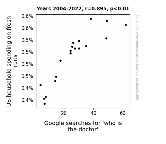 This means 80.2% of the change in the one variable (i.e., Google searches for 'who is the doctor') is predictable based on the change in the other (i.e., US household spending on fresh fruits) over the 19 years from 2004 through 2022.