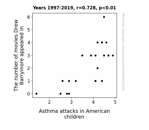 This means 53.1% of the change in the one variable (i.e., Asthma attacks in American children) is predictable based on the change in the other (i.e., The number of movies Drew Barrymore appeared in) over the 23 years from 1997 through 2019.