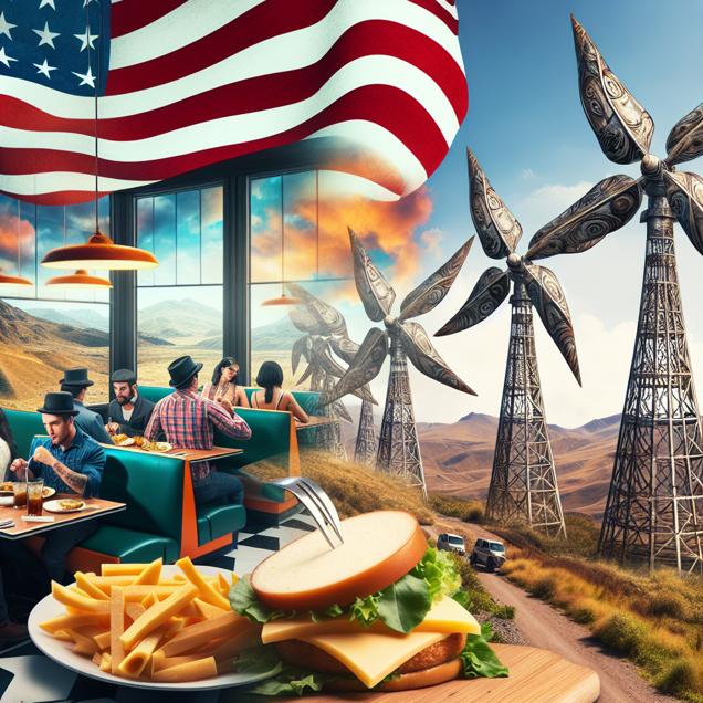 ChatGPT: Generate an image of an American diner with a steampunk twist. In the center, patrons enjoy their meals, while old-fashioned, metallic wind turbines are visible in the background. As the gentle breeze blows through the diner, the scene transitions seamlessly to show the turbines spinning fiercely in the Peruvian landscape. The transition should illustrate the journey of the wind, symbolizing the interconnectedness between the joyous consumption of American cheese and the sustainable energy generation in Peru.