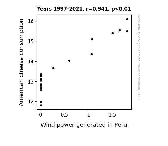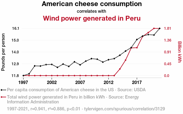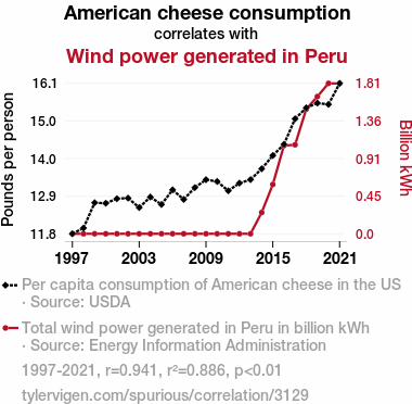 - The spurious research paper: Cheesy Correlations: Connecting American Cheese Consumption with Wind Power in Peru