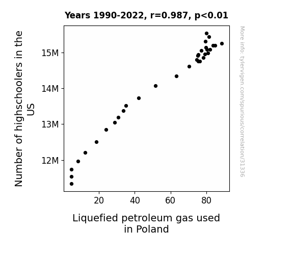 This means 97.5% of the change in the one variable (i.e., Liquefied petroleum gas used in Poland) is predictable based on the change in the other (i.e., Number of highschoolers in the US) over the 33 years from 1990 through 2022.