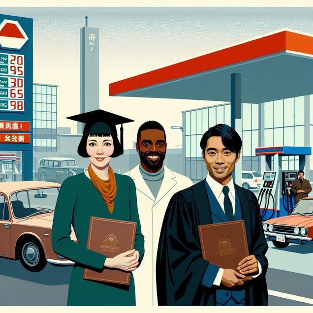 ChatGPT: In a bustling city in Japan, a group of architects proudly receive their Master's degrees in Architecture and related services. Their faces beam with pride as they hold their certificates and stand in front of a newly designed building. Nearby, a gas station pumps gasoline into a few cars, as the traffic in the area has reduced due to the fewer buildings being constructed. The link between the two becomes clear - less construction means fewer cars, resulting in less need for gasoline in Japan.