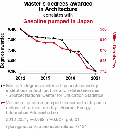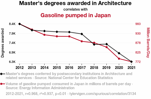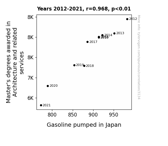 This means 93.7% of the change in the one variable (i.e., Gasoline pumped in Japan) is predictable based on the change in the other (i.e., Master's degrees awarded in Architecture) over the 10 years from 2012 through 2021.