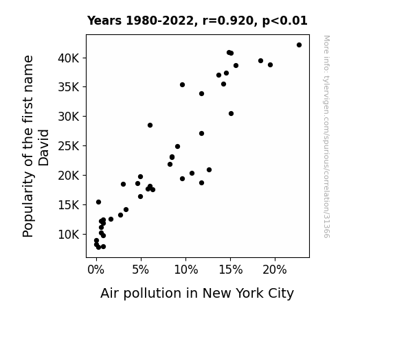 This means 84.6% of the change in the one variable (i.e., Air pollution in New York City) is predictable based on the change in the other (i.e., Popularity of the first name David) over the 43 years from 1980 through 2022.