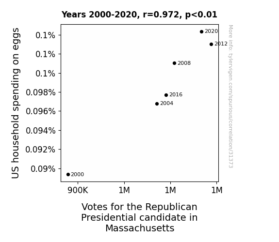 This means 94.5% of the change in the one variable (i.e., Votes for the Republican Presidential candidate in Massachusetts) is predictable based on the change in the other (i.e., US household spending on eggs) over the 6 years from 2000 through 2020.