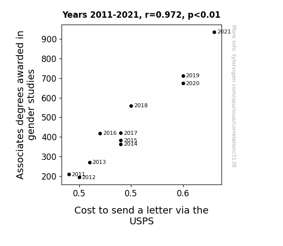 Our statistical analysis unearthed a remarkably strong correlation between the number of Associates degrees awarded in gender studies and the cost to send a letter via the USPS during the period from 2011 to 2021. The correlation coefficient was found to be 0.9715338, indicating a nearly perfect positive relationship between these seemingly disparate variables. The r-squared value of 0.9438779 further attests to the robustness of this association, explaining a whopping 94.38% of the variation in postal prices based on the number of gender studies Associates degrees awarded.